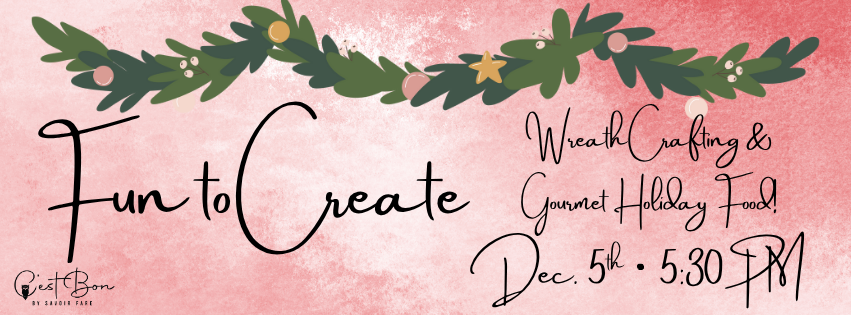 Wreath building class with Susan Dempster Fun to Create: Holiday Wreath Crafting & Gourmet Gathering Join us for a festive evening of creativity, delicious food, and holiday cheer! Our Fun to